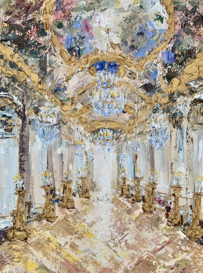 Versailles Hall of Mirrors Oil Painting On Canvas *Title: „Hall of Mirrors at Versailles“ *Size: 11.8"x15.7" [30x40 cm] *Original handmade oil painting on canvas by brush and palette knife. *Made by me - Vilma Gataveckiene. This is not a copy or a print. *Signature on the front and on...