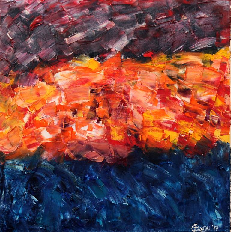 Vesuvio (2017) Oil on Cotton Canvas Dimensions: 50 x 50 x 4 cm Instinctive palette knife oil painting with rough thick textures, expressing the thermal energy of intense volcanic eruptive movement as imagination isolates the active Vesuvius. The multilayered thermal energy of Vesuvius is captured i...