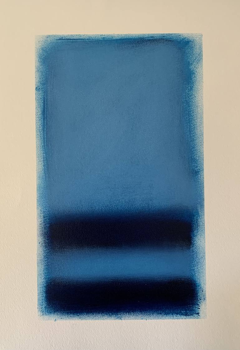 This is one of a series of small oil paintings on paper. A base of Primary Blue and Paris Prussian Blue. Artwork featuring this color pallet and composition will bring a sense of simplicity to your living space and help create a warm and serene atmosphere. It is signed on the back. A frame is pre...