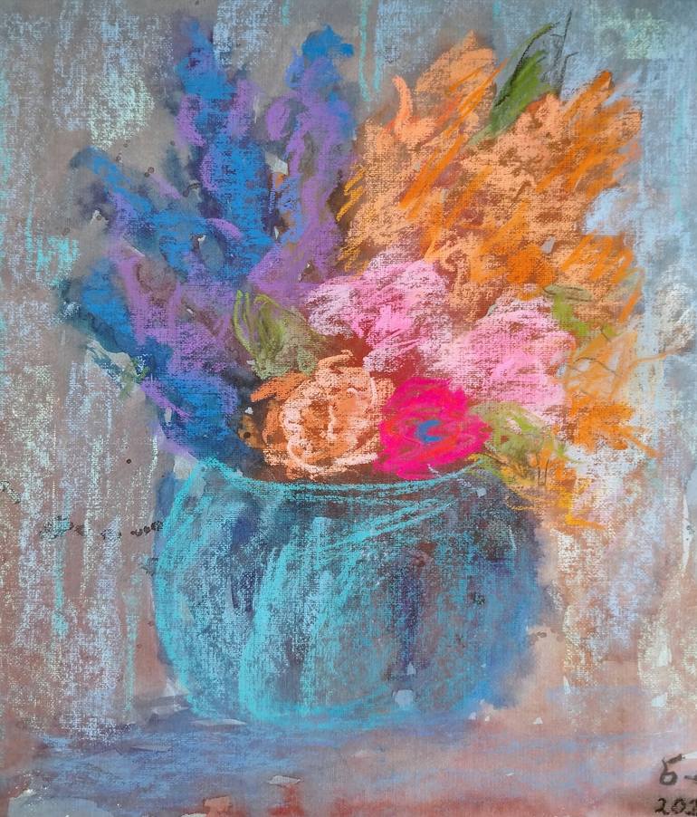 “Vibrant Blooms in Blue Vase” is a radiant still life created in soft pastel on paper. This expressive floral composition bursts with energy and color, featuring a lush arrangement of flowers in vivid tones—magenta, orange, pink, lilac, and peach—nestled in a rich turquoise-blue vase. The painterly...