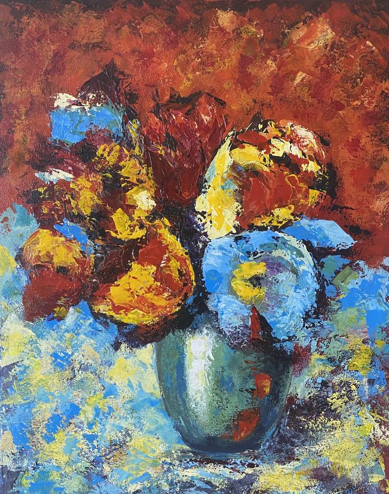 Vibrant Floral Still Life – Original Textured Acrylic Painting on Canvas/ Infuse your space with the lively energy of this original floral still life painting, meticulously crafted to captivate and inspire. This artwork showcases the untamed beauty of flowers, rendered with rich palette knife text...