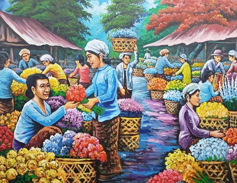 Immerse yourself in the kaleidoscope of colors with “Vibrant Petals: The Flower Market’s Tapestry,” a stunning 90x70 cm canvas that brings the exuberance of a flower market to life. This painting is a celebration of diversity and vibrancy, capturing the essence of a bustling marketplace where the fr...