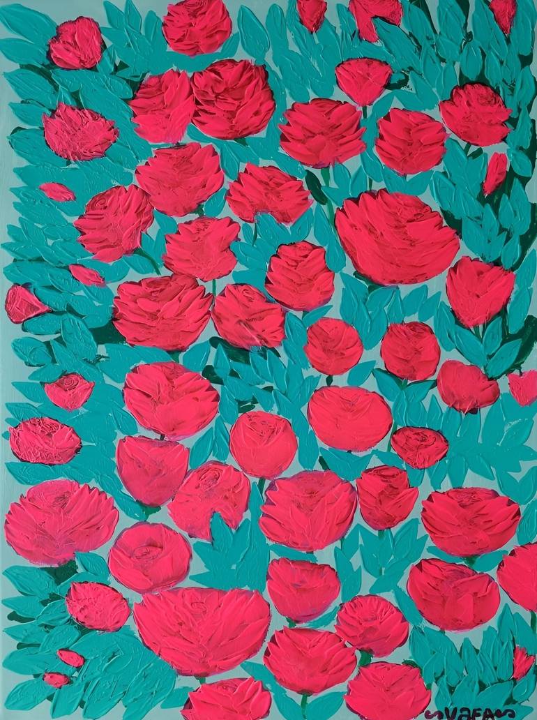 Discover a burst of vibrant energy with this stunning piece of Mid-Century Modern floral art that captures the eye and ignites the imagination. This close-up painting showcases a lush cluster of neon pink roses, each rendered with bold, expressive brushstrokes that add rich texture and a three-dimen...