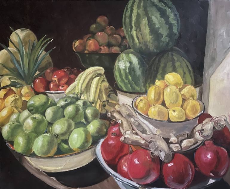 This hand-painted oil painting beautifully captures the vibrancy of fresh fruit in a classic still life composition. The rich textures of apples, watermelons, bananas, lemons, and pomegranates bring warmth and elegance to any space. This original oil on canvas artwork is perfect for kitchen decor, o...