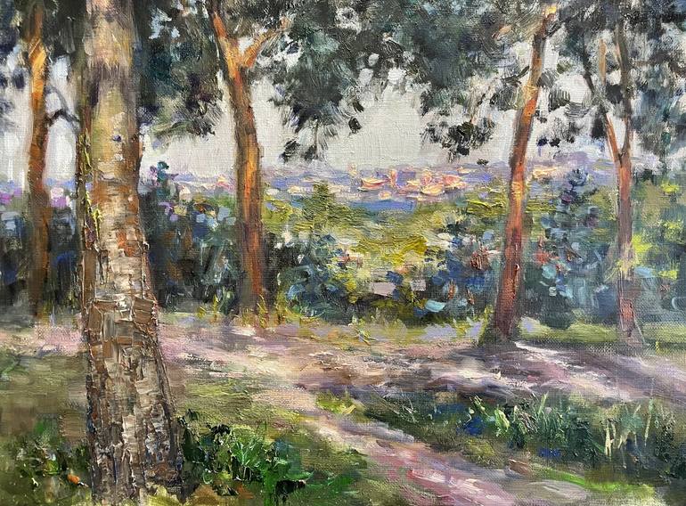 The View of the City from Hampstead Heath, London Oil on stretched linen 30x40x2 cm *** This painting depicts the City in the evening pink light from Hampstead Heath, London. Painted on location or plein air in impressionistic style to capture the light and colour of the moment.