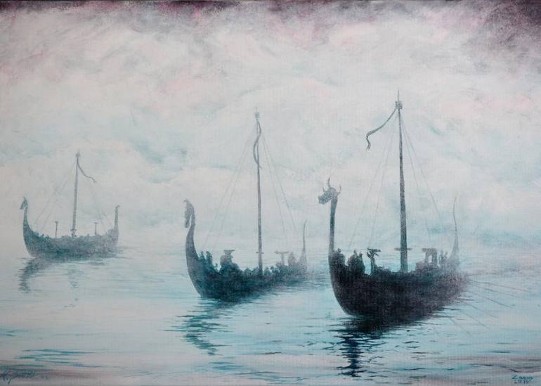 Three Viking ships emerge from the mist, perhaps innocent merchants, or sending a chill down the spine of local farmers? My first, and in my opinion best of a series of 14 Viking ship paintings that I created 5 years before I discovered my blood includes 30% Finnish DNA. which begs the question, .....