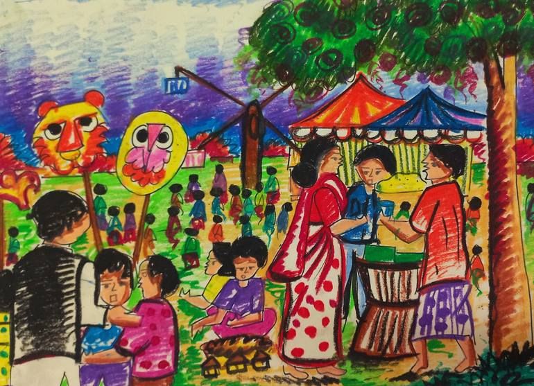 A picture of a village. Common people went to the fair with their families. They are listening to music, they are shopping for their favorite things. It is a day of joy for many of them...
