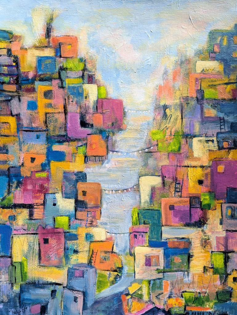 I am inspired by the calm moments just before a bustling day begins. The soft light and vibrant colors reflect a sense of hope, connection, and the stories that come alive as the day unfolds. Original 2024 mixed media on watercolor paper 18x24 in. (46x61 cm). Artwork will be carefully rolled for sh...