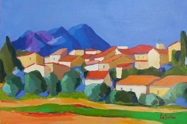 This small oil painting shows a small village near the town of Limoux in the south of France. Lit by the hot summer sun it stands out against the foothills of the Pyrenees. In the foreground olive trees, vineyards and sunflower fields add a colorful touch. This painting was made in -situ with brush...