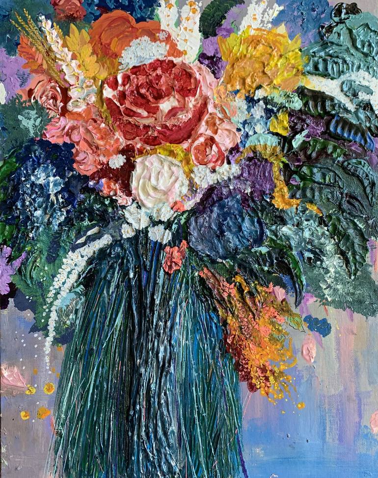 What can a bouquet say? A handful of flowers can bring joy, love, laughter. I wanted to capture the smile a bouquet can bring to someone's face in this abstract piece, through bright colors and 3D acrylics. The audience should feel like they can take a flower right off the canvas.