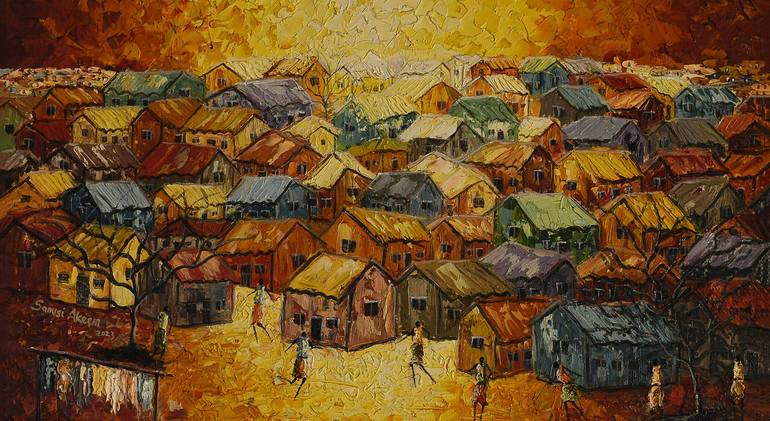 VILLAGE SCENE This art piece depicts local and traditional arrangements of thatched roof houses commonly found in Africa. These communities are mainly dominated by farmers. Moreover, there are trees, a variety of crops, diversity of flowers, rivers and lots more and besides, you feel the cold breez...