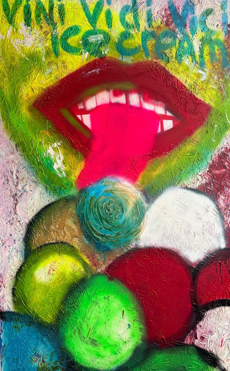 Title: Vini, Vidi, Vici or was it…? This piece is a vivid visual paradox: the sweet, sticky surface of external pleasure collides with the question of its true worth. Bright colors, a screaming pink tongue, sparkling “scoops” (perhaps ice cream—or something else?), all symbolize temptation, the rap...