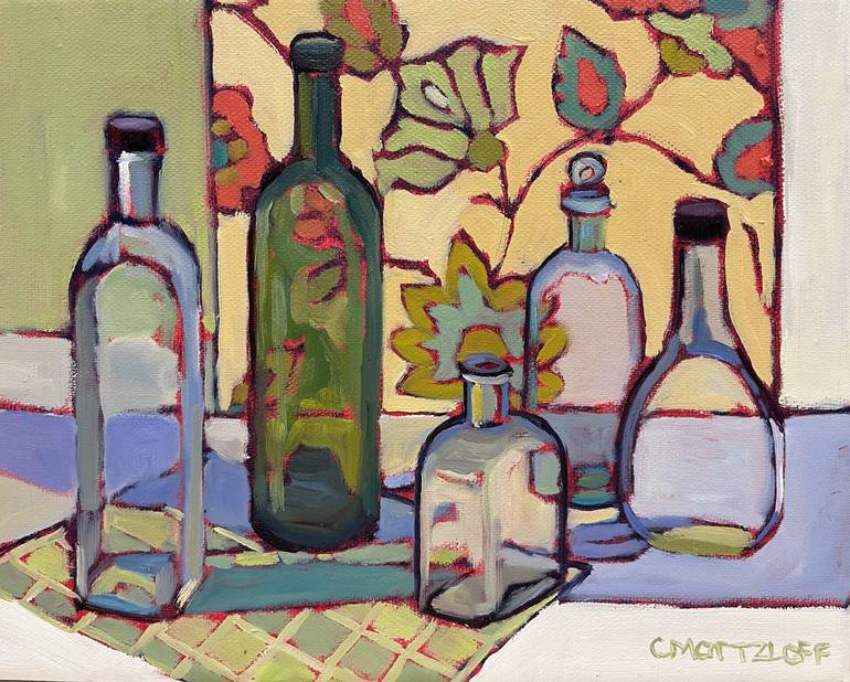 "Vintage Apothecary" is an enchanting 8" x 10" still life oil painting that captivates with its charming depiction of a collection of vintage glass bottles. Set against a vibrant backdrop of colorful floral wallpaper, each bottle, with its unique shape and size, invites viewers into a world where hi...