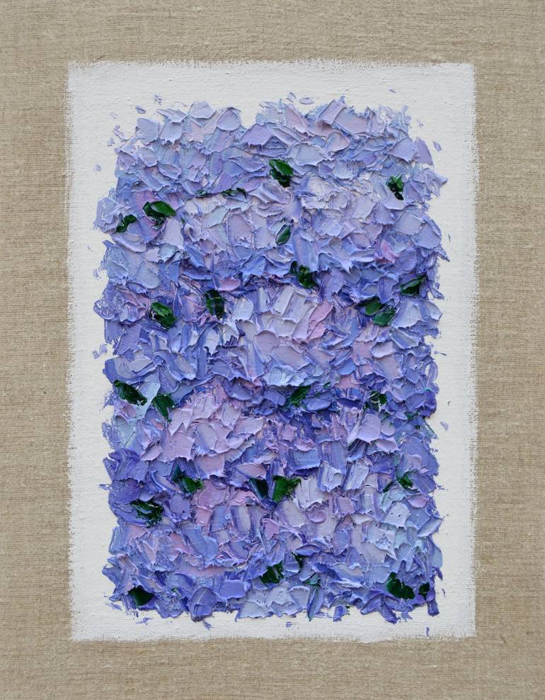 Heavily textured abstract hydrangea painting on raw Belgian linen. Wired and ready for hanging or framing.