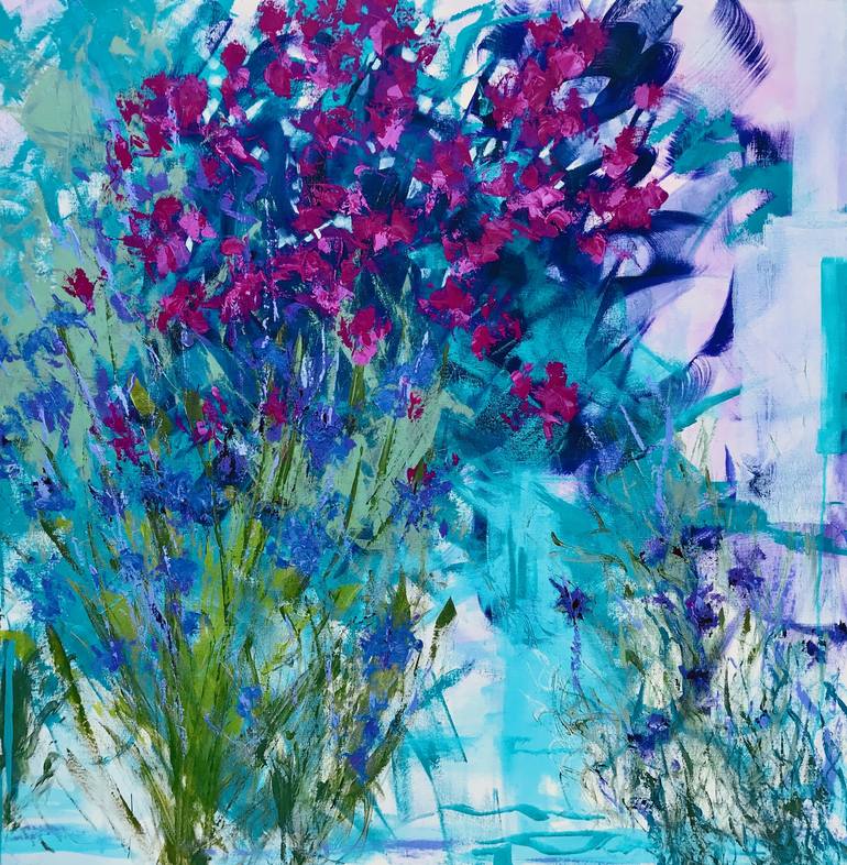 I find inspiration in nature, art, design and life experiences. My art is an abstracted expression of space, form and movement extending beyond present time and place. I work to express the yin and yang of life, ranging from the tough to the sublime, from turmoil to tranquility. My color palette leans toward blues, greens, and other cool tones with splashes of warm, vibrant hues. I tend to paint thinly in some areas, increasing thickness for contrast and emphasis. My primary medium is acrylic. I often integrate fabric, paper, glass, beads and other materials for texture and complexity of expression.