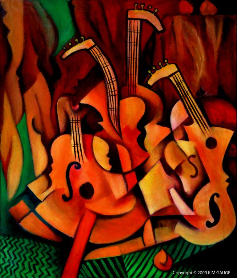Following the same tradition that made painters like Pablo Picasso and Georges Braque famous, this oil painting has been painted in the cubist style and depicts a collection of musical instruments including violins, a mandolin and some fruit. Oil on canvas. Painted circa 1991-1993.
