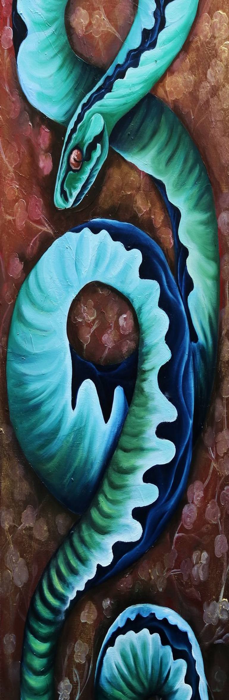 This oil painting captures the duality of nature through the presence of a viper—both a symbol of wisdom and transformation. The elongated 90x30x5 cm canvas enhances the fluidity of the snake’s form, allowing it to command the space with both movement and stillness. Inspired by the viper’s role in ...