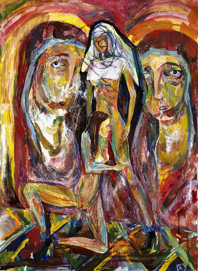 Sex education is embedded both in the family and in society. In Russia there is still a question when a girl is allowed to lose her virginity. And how this will affect her family life. The artist depicted herself kneeling before a nun. The girl touches with her lips the seemingly forbidden fruit... ...