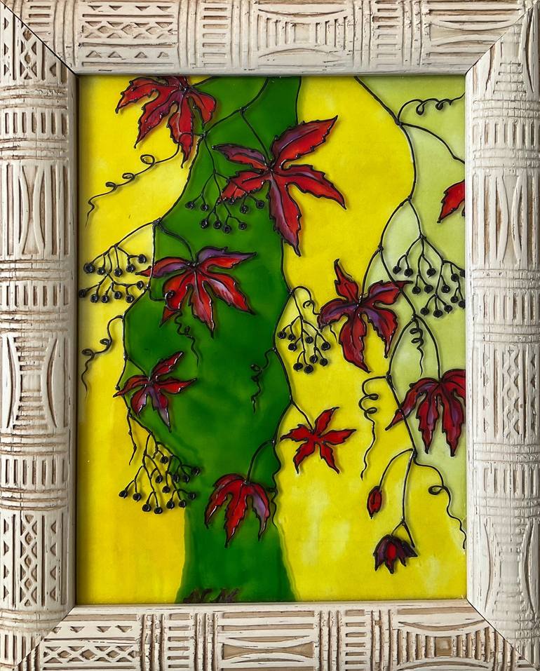 "Virginia creeper". Kazakhstan, Almaty, autumn... The colors of autumn delight the eye All sketches and paintings are original. The glass painting will be beautifully and carefully packaged. Woodframed. Certificate of authorship included