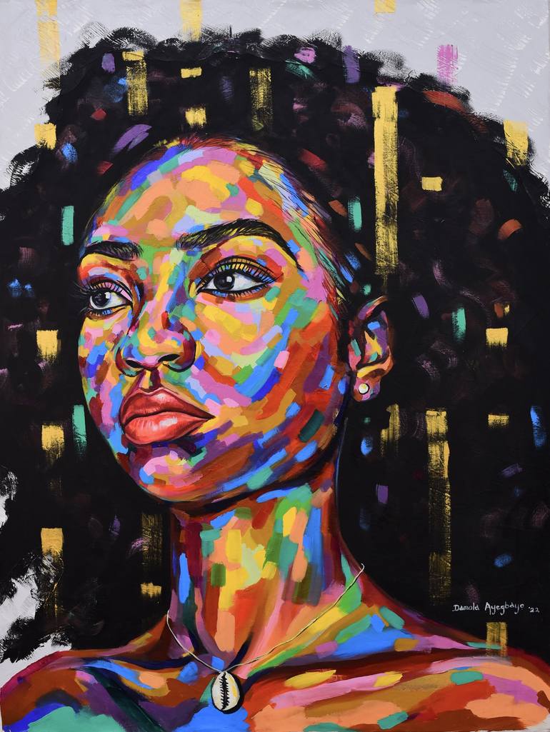 Damola Ayegbayo is an acclaimed visual artist, celebrated for his mastery in paintings and drawings that deeply reflect his personal heritage and cultural narratives. Born in 1988 in Ejigbo, Osun State, Nigeria, Damola pursued his passion for art at Obafemi Awolowo University, earning a Bachelor’s degree in Fine and Applied Arts. Damola’s art has gained international attention and acclaim. Notably, his work was commissioned for the 2023 film adaptation of “The Color Purple.” He also gained recognition in the world of digital art, being the only African artist featured in the World of Women NFT projects, collaborating with prominent platforms such as OpenSea and Saatchi Art. Damola has exhibited his work globally, including in Nigeria, the US, the UK, Canada, and Europe. His paintings have been auctioned by renowned houses like Jasper52, LiveAuctioneers, and Bidhaus, and have found homes with private collectors such as Marcus Gardley, Jimmy Akingbola, and Lisane Basquiat. In 2022, his piece “Unconditional Love 2” was featured on the cover of HarperCollins Publishers’ “Relations: An Anthology of African and Diaspora Voices.” His work “Purpose of Existence” was used in a campaign by Cambridge University Press to promote black women’s mental health. In 2023, his artwork “Vision of Hope” was highlighted in Jimmy Akingbola’s documentary “HANDLE WITH CARE.” The name of my painting style is called ÀBÈFÉ meaning ( pleaded to be loved) which is my native name. my craft is an expressionism style of art, I use portraits of beautiful black women to speak to society about morals, good behavior, love, and unity. an image of a black beautiful woman always reminds me of how my strong mother trained and brought me up with love and good morals helping me to discover my real self, the concept of using a black woman is a great reference to my loving mother and the role Other women had played in my life, their importance and existence in the world can not be underestimated. He is inspired by his late grandfather that was a painter, sculptor, and ceramist from a tender age, as his love to practice art increased in the university by meeting with greater like minds in the department and visits many art galleries and art departments in other universities, also traveled to historic ancient cities and art workshop etc..