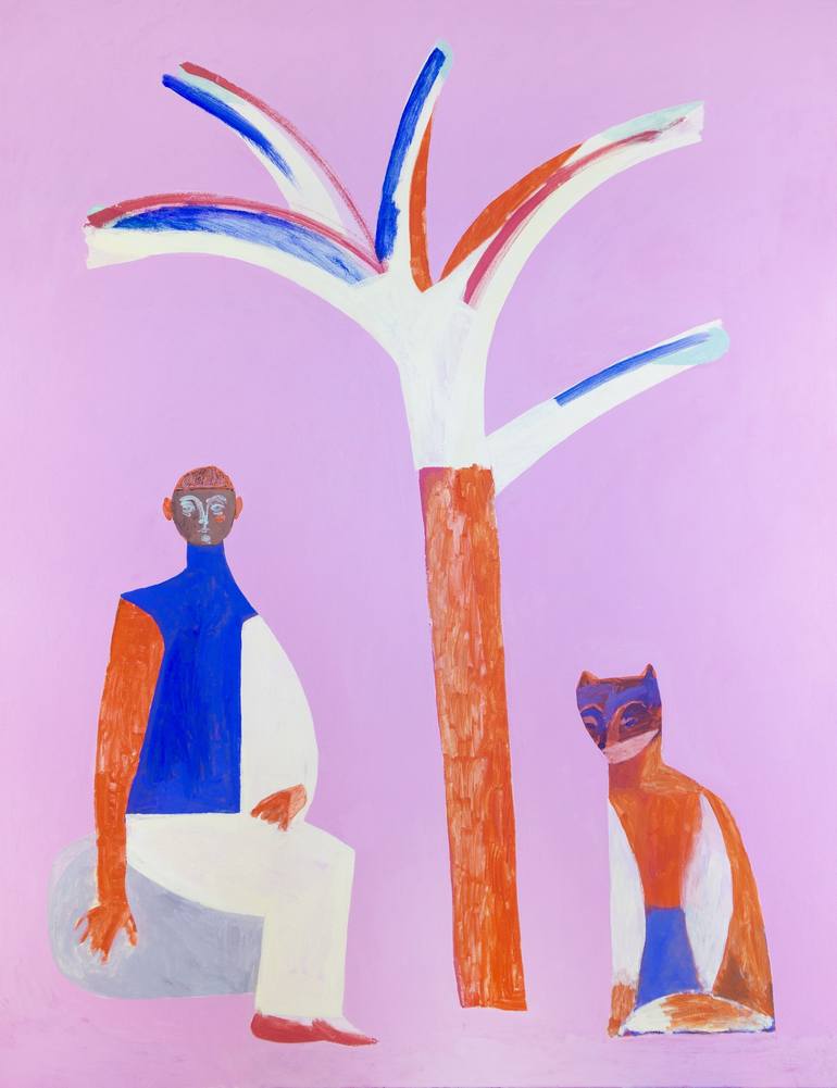 This painting was conceived as a kind of oasis in the desert. A tree in the shade of which is cool and a rock on which you can sit to rest. The characters are like silent wayfarers in a kind of timeless space. The painting is intended to create this pink space around itself, to include the surroundi...