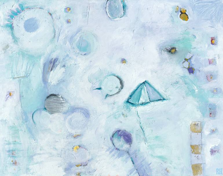 This painting is light, floating, whimsical. Lots of interesting shapes and textures. Creates a feeling of joy and expansion.