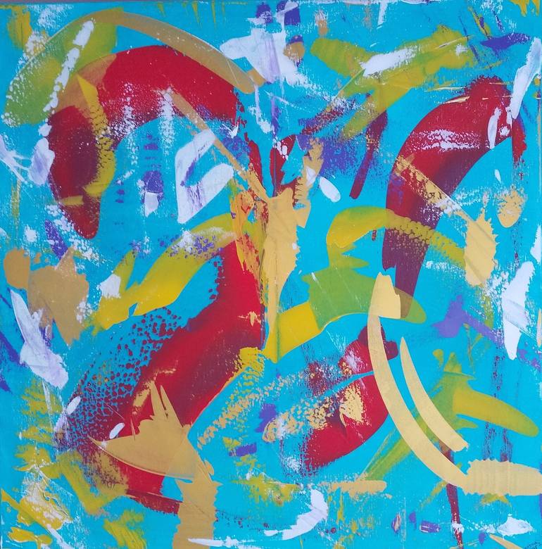 Acrylic on canvas "Vivace2" 90x90cm 2025 original signed... Vibrant splashes of red, yellow, and blue intertwine, creating a dynamic and lively composition. Bold brushstrokes and overlapping colors give the piece a sense of movement and energy. -------------------------------------------------------...