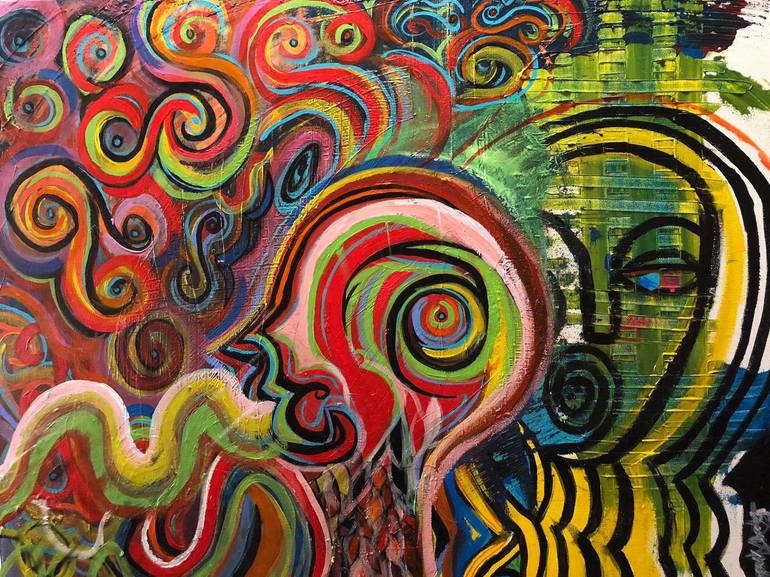 Acrylic on Gallery Wrapped Canvas - 30x24 Painting Knives/Brushes Inspired in part by the song, the figure on the right warns the one on the left to “Hush, Hush! Voices Carry.” The swirling colors are the voices, with blue eyes hidden in some (evil eyes to protect against jealousy and negative int...