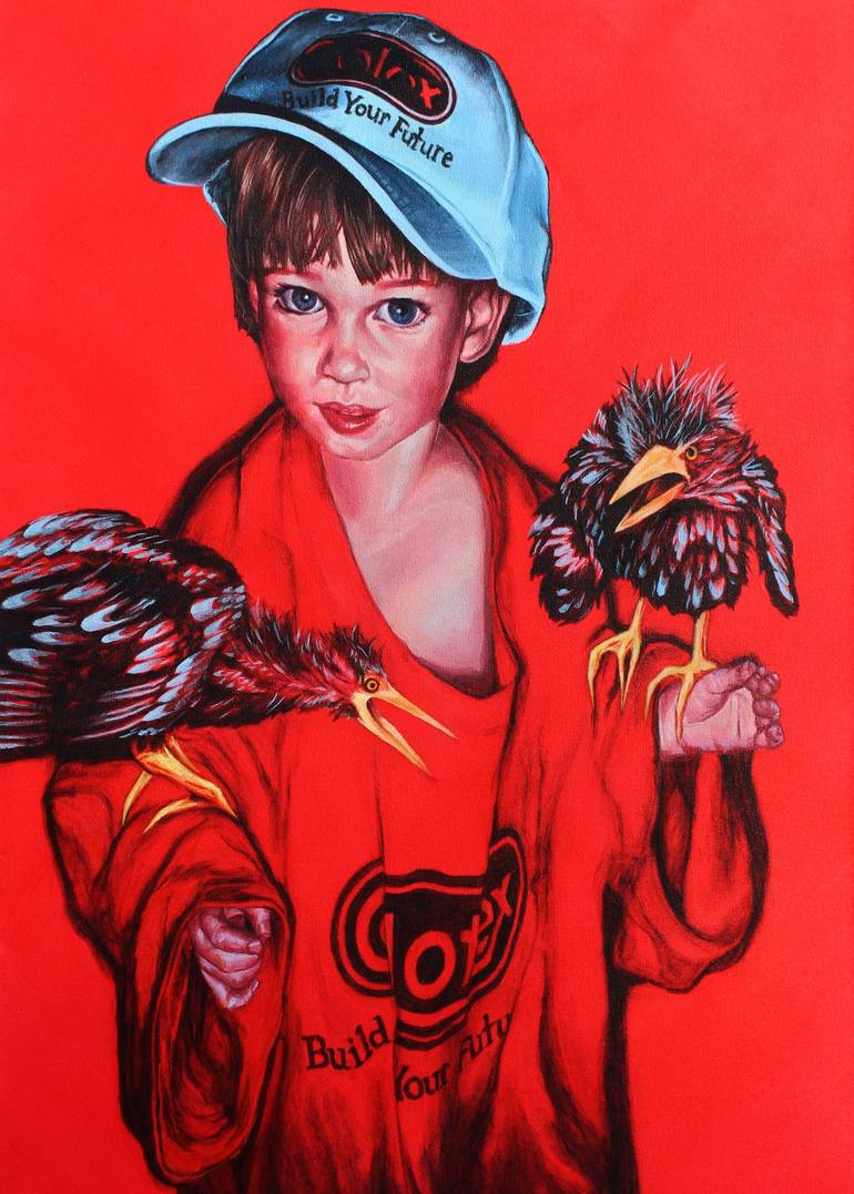 This is the eighth in a series of red Void paintings, showing childhood self-portraits with baby blue herons.