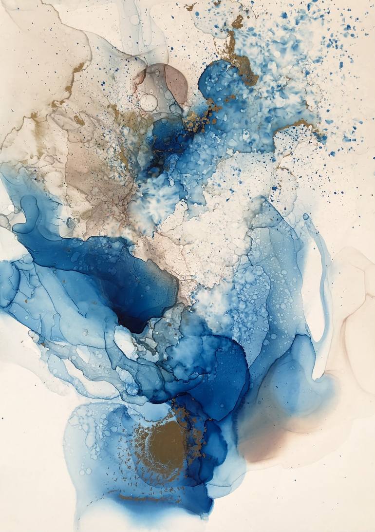 An abstract painting made with alcohol inks on paper. Decorated in delicate colors of blue and beige with the addition of gold. Delicacy and elusiveness are the main motives of the work. Gilding gives character and enlivens the image. The work is framed in a white passe-partout and black frame w...