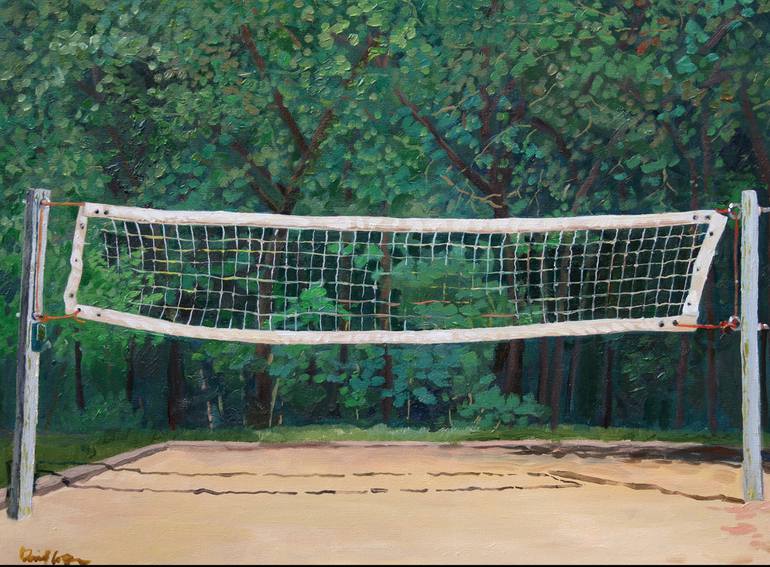 Vacant volleyball net in sand pit patiently waits for the next game.