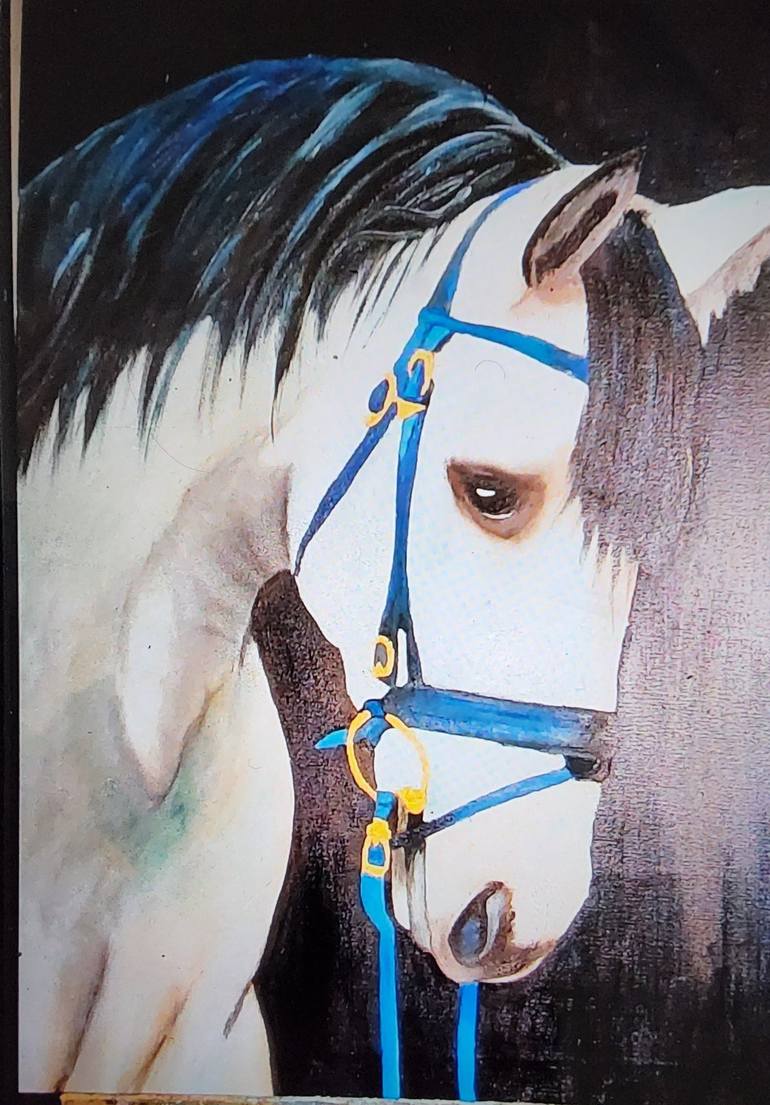 WHITE HORSE this is original oil painting on canvas beautiful horse to inspired me to make it paint it made by asian art work, by windsor oil color mixed with linseed oil On quality of canvas gresso last varnished and framed with the silver color