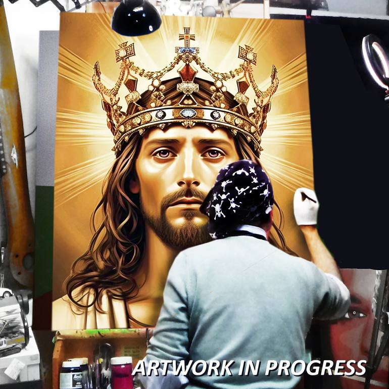 This captivating, oversized painting, "WHITE JESUS," offers a contemporary exploration of religious iconography. Created with acrylic on canvas, this figurative piece blends elements of Classical and Contemporary to present a powerful diptych. The artist's research into the diverse representations o...