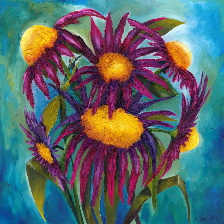 This is an original gallery wrapped acrylic painting titled "Wild Flowers". The painting is of wild flowers with accents on the petals expressed with various hues of reds and magenta and yellow hearts ... the flowers dance across the canvas with a teal and jade like background. This painting fits i...