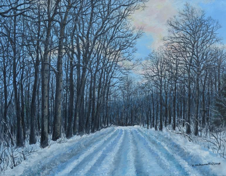 This is the second painting from the same reference photo taken on a snowy Thanksgiving Day on the field road to the gas well on the family farm near Gerry NY. It is painted with professional quality Windsor & Newton oils on a 16 X 20 inch canvas, and the half inch sides of the canvas are painted b...