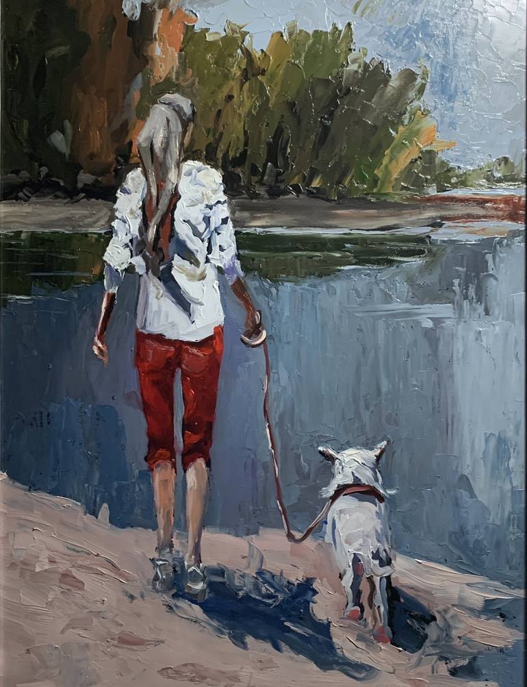 Woman walking with a dog. This is one of a kind original oil painting. Figurative artwork, female figure. ►100% handmade oil painting on MDF gesso board ►Dimensions: 56 x 41 cm. (unframed); 65 x 50 (Framed) ►To see the details of the painting; please click "ZOOM" to enlarge the images. ►It is made i...