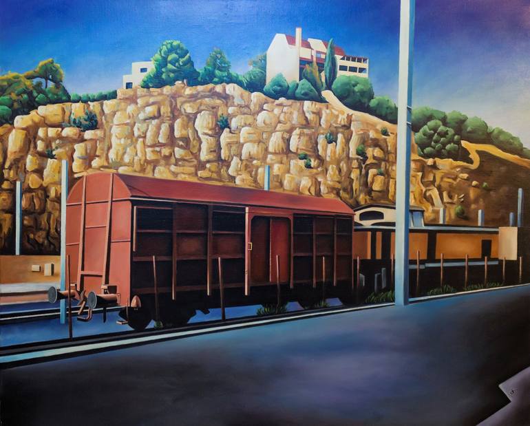 Train et wagon en gare de Cerbère (oeuvre de jeunesse) Huile sur Toile de lin sur châssis bois Dimension : 81 × 100 cm par Lionel Le Jeune Pièce unique originale et authentique, livraison gratuite et sécurisée