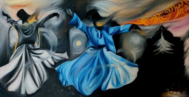 The painting portrays two Sufis in motion, with black and blue as the dominant colors. The dark background enhances the painting's eerie atmosphere. It captures the feeling of disillusionment and the way a person can become so lost in the pursuit of their dreams that they lose their sense of self, q...