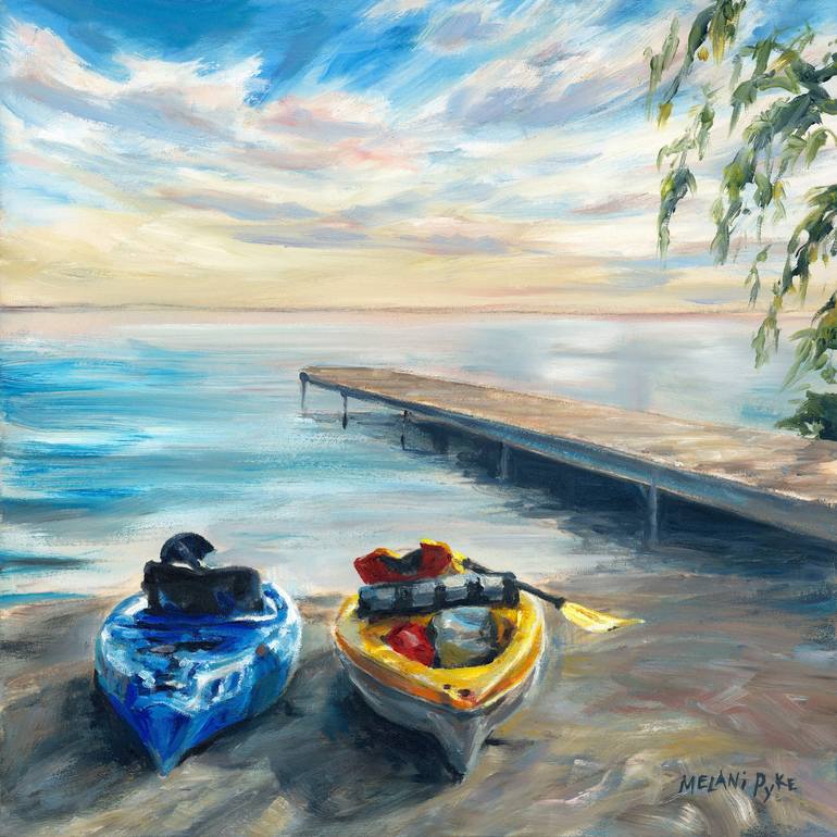 A tranquil lakeside scene features two kayaks resting on the shore near a wooden dock, with the calm water reflecting the soft colors of dawn. Gentle clouds scatter across a brightening sky, while distant trees frame the serene landscape. Inspired by my kayaking adventure on the Niagara River and Fr...