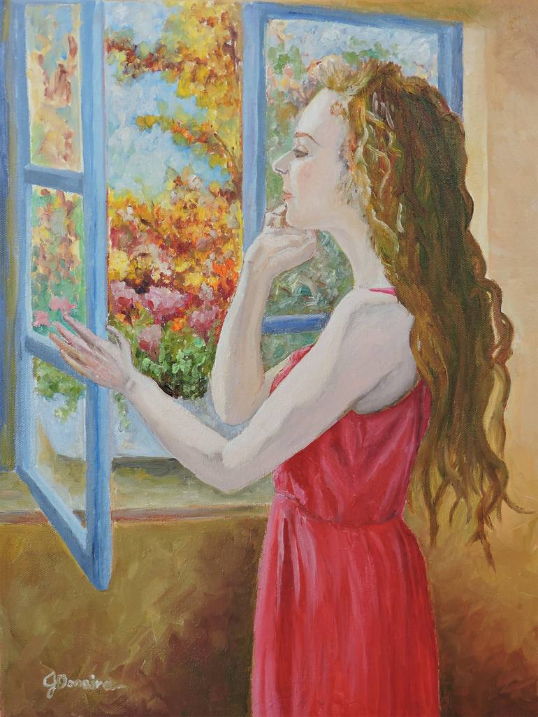 This is part of my Autumn series for 2020. Waiting is a beautiful painting of a woman in a red dress. I used gesso and oil paint on canvas.