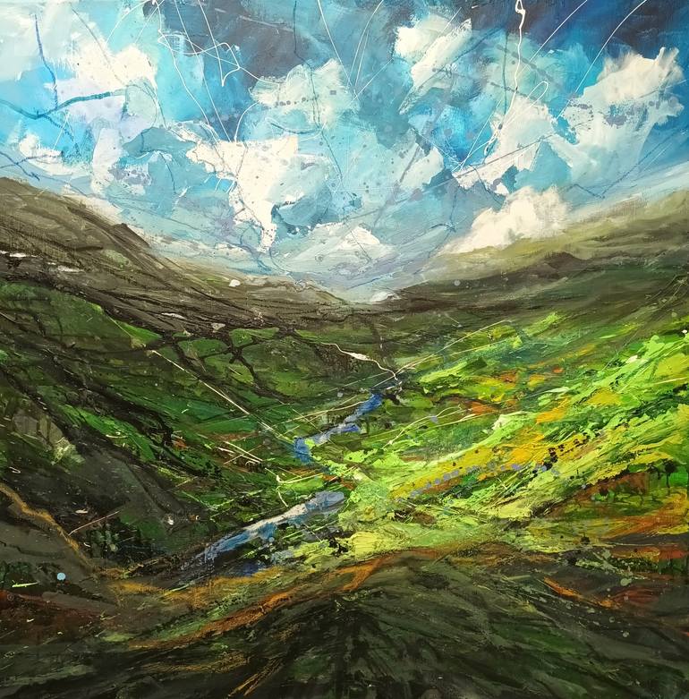 The beautiful country of Wales with the many brown and green hues and colors is the starting point for this painting. In the distance you can see the mountains and in the foreground you see a stream running through the valley. The sun's rays illuminate the right flank of the mountains and give the p...