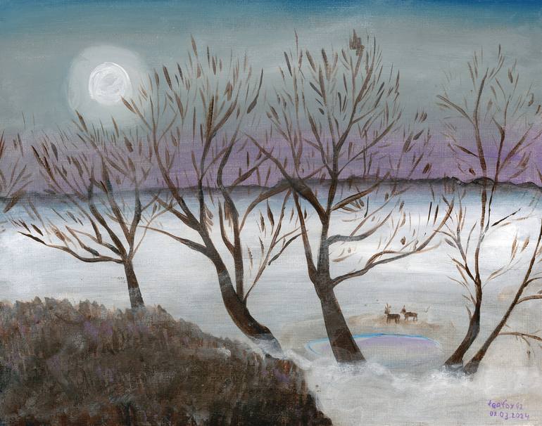 Once, I witnessed a beautiful full moon. It was dawn, and there was a lot of mist. Somewhere nearby, deer were strolling by the lake. The artwork is painted with acrylic on primed cardboard.