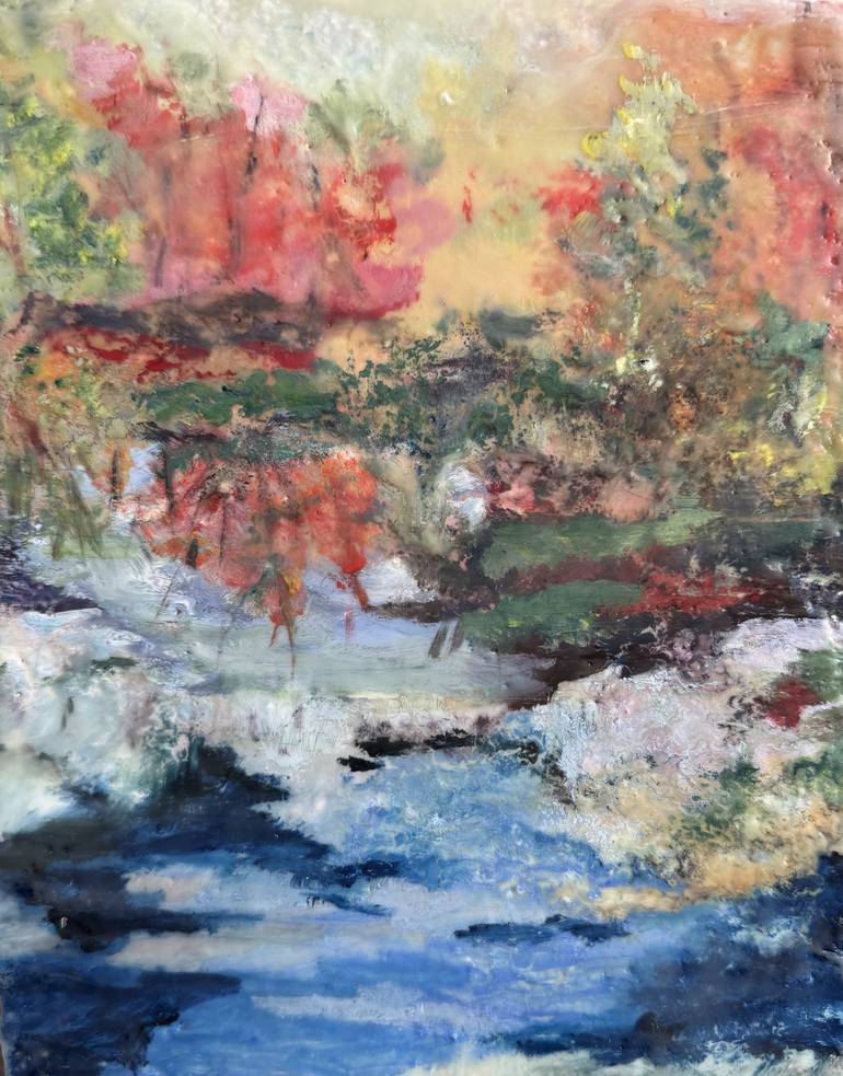 encaustic on cork give this impressionist landscape a tactile texture in addition to its color texture for a mysterious moody experience