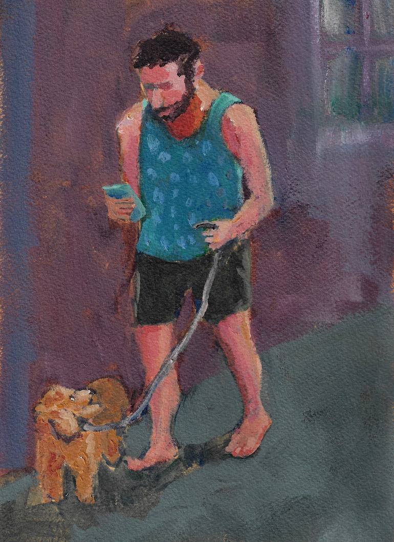 He was walking his dog, but not really paying attention. The dog kept looking back as if to say, "Pay attention to me not your phone. What's so interesting, anyway?" Maybe he was reading the news or maybe he was on grindr