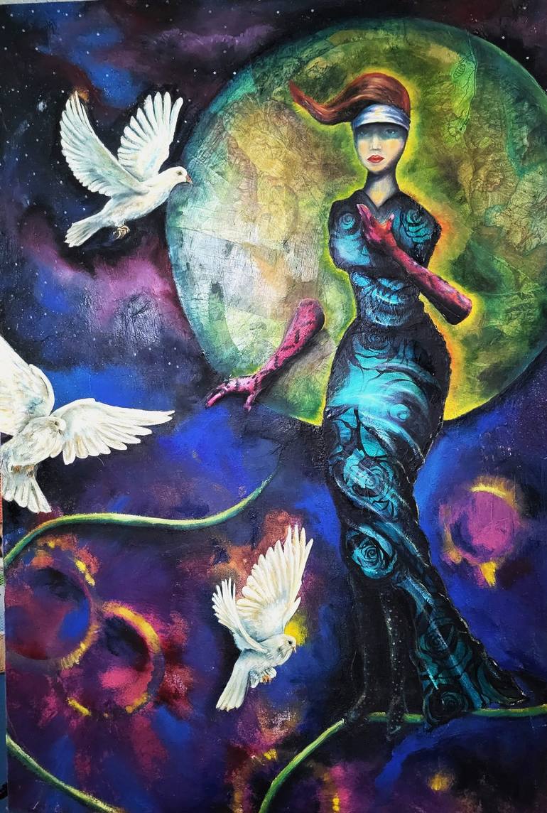 The subject of the painting is a woman standing in front of the moon with doves flying around her. On her head she wears a white cloth headdress. This painting focuses on exploring womanhood, celebrating female strength and wisdom. The white cloth symbolizes life’s obstacles that create challenges, ...