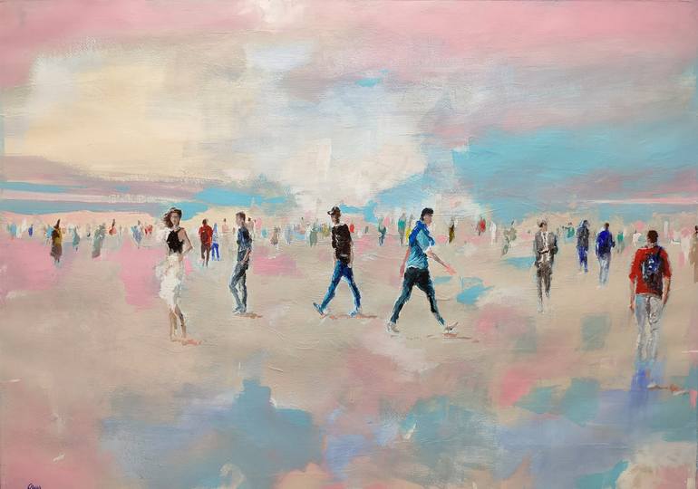 Acrylic and gesso on "Canson" paper of 300 grs. Fantasy scene of people walking through the sky. I return to my old series of walks in the sky. My inspiration is the Light and the Calm in an atmosphere devoid of any material element.