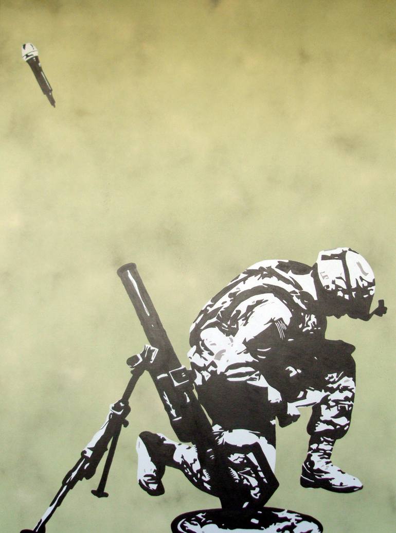 This piece is my statement that wars can be resolved with words and not weapons. The image features a soldier launching a microphone instead of a rocket