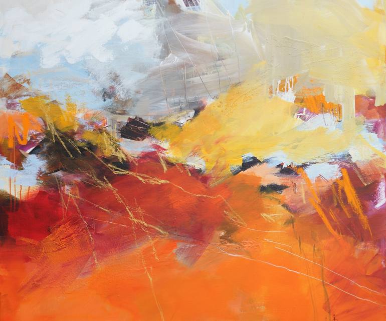 Materials: Stretched canvas, Acrylic and Oil Pastel Sides: Painted as a continuation of the motif Frame: Unframed, further framing possible but not necessary. Varnish: Silky finish with UV protection Signature: Front and verso, also signed Certificate of Authenticity The work will be shipped stretch...