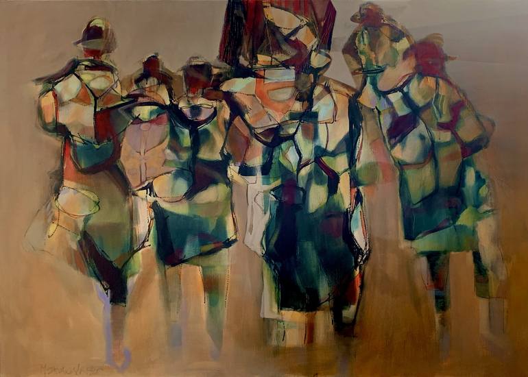 I started in my art-education with photography, but changed quickly to art, design and illustration. After the Academy of Arts I landed in Amsterdam and stayed there for 23 years, then running a creative centre elsewhere. Now i live and work in the North of the Netherlands, where I created a only-Art-related-environment: member of group of artists and participating in an Art-foundation. About my artwork: At first sight there is a lot of movement in my paintings, but if you look closer there is no direct movement at all. The figures are there, they look at you, but you can't look them in the eyes. They want to stay incognito. They do not want to be recognized. It is all a structure of lines, together with an often simple use of color. About my other artwork: Every year I paint images of completely abandoned villages and empty flat landscapes.