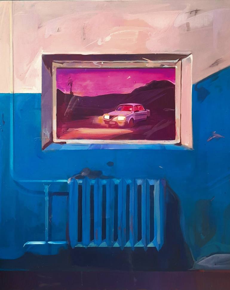 The work was created as a need for touch. A cold room represents loneliness, and the radiator is the same blue, cold color, it is not functional. The window is hope if the car appears as a symbol of the new and warm.